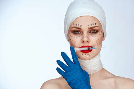 female patient in blue gloves syringe in hands contour on the face lifting light background