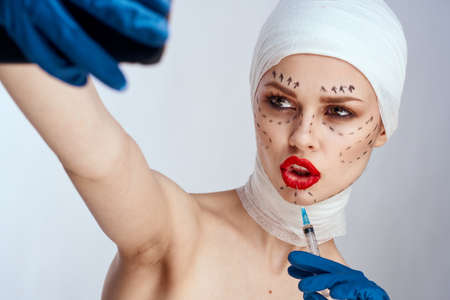 female patient Red lips plastic surgery operation bare shoulders studio lifestyle