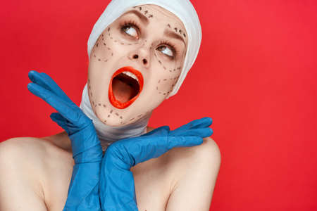 woman posing in blue gloves red lips surgery facial rejuvenation red background