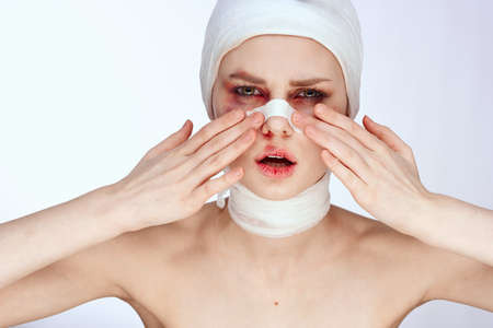 Beauty, fashion and medicine, plastic surgery. Portrait of an attractive young woman in bandages and hospital gown. Studio shot.