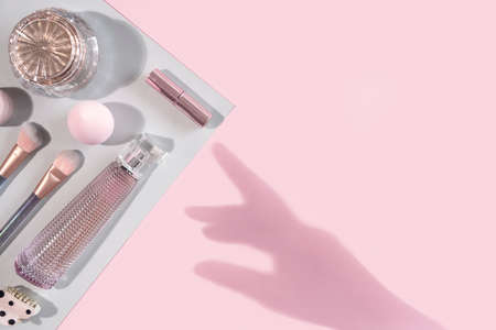 Beauty flat lay with cosmetic fashion makeup accessories on pink and gray background with hand shadow. Top view, flat lay, copy space