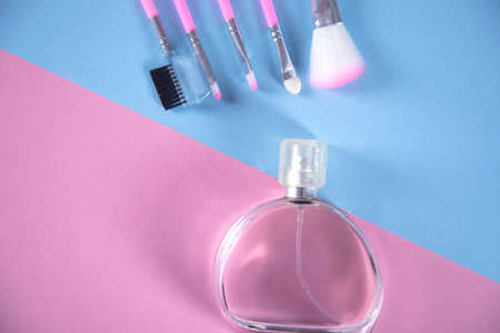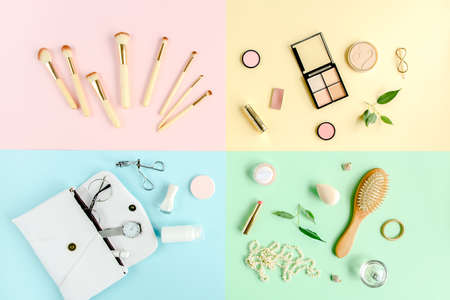 Set of decorative cosmetics with makeup brush on colorful pastel background. Minimal style composition. Top view