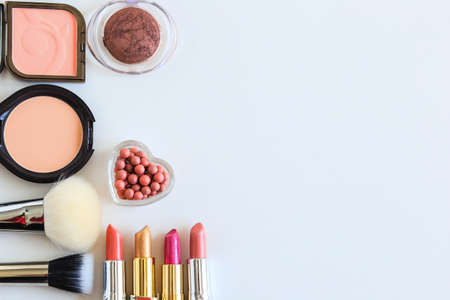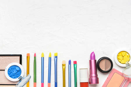 decorative cosmetics, shadows, lipsticks, blush and brushes for applying makeup lie on a white surface top view