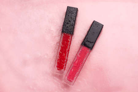 Lip gloss and water drops on a pink background. The concept of a bottle of lip gloss without labels. Cosmetology. Decorative cosmetics. Copy space