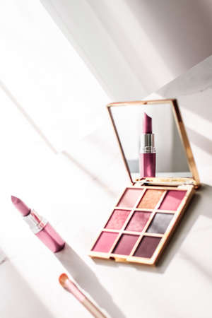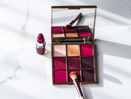 Cosmetic branding, girly and glamour concept - Cosmetics, makeup products set on marble vanity table, lipstick, eyeshadows and make-up brush for luxury beauty and fashion brand ads, holiday design