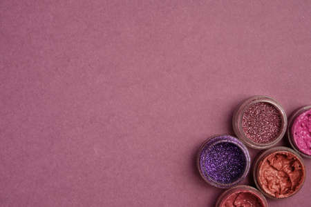 Glitters and lipsticks in lilac colors stand in the corner against a plum textured background