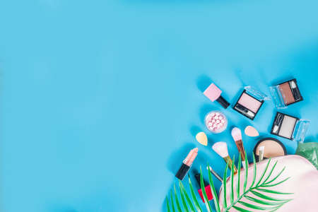 Professional makeup cosmetic set, with summer tropical leaves, woman bag. Make up items. luxury decorative cosmetics flatlay, top view, mockup. Beauty blogger concept. Trendy turquoise background
