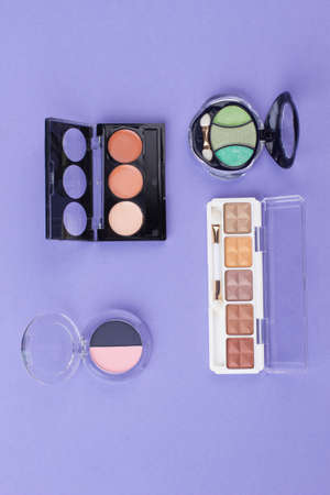 Set of poweder-case collection. Top view flat lay. Isoalted on purple background.