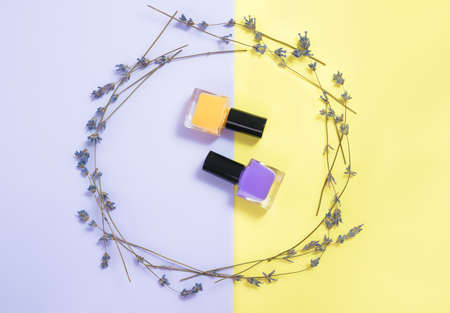 Purple and orange nail polishes on blue yellow background. Set of nail polish bottles decorated with flower circle.