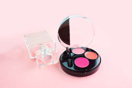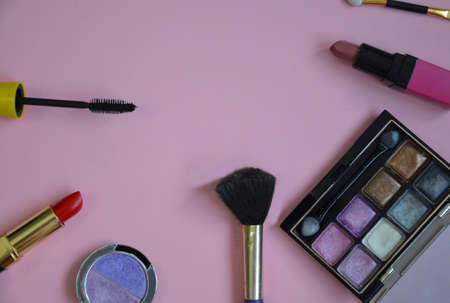 set of beauty cosmetics for female face and eye makeup on pink background . photo