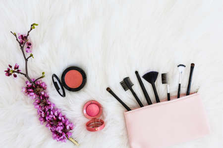 Refreshing spring makeup cosmetics concepts. Fresh spring flowers and female cosmetic bag with various accessories - brushes, pattern, powder