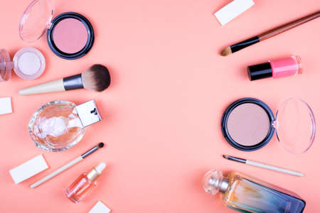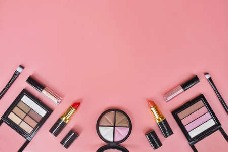 Flat lay composition with makeup cosmetic on pink background