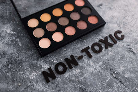 low tox and natural beauty products conceptual image, make-up palette with non-toxic text on grey background