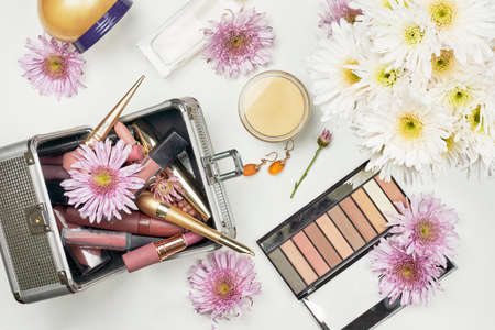 Makeup cosmetics with accessories on white background