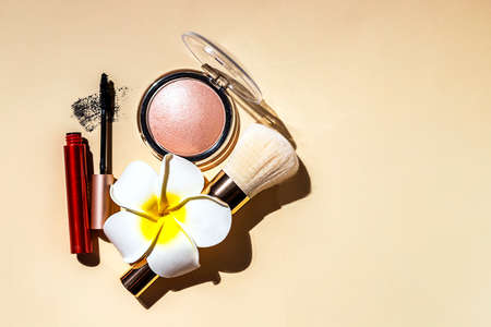 Decorative flat lay composition with cosmetic powder, brush, mascara on beige background. Hard light. Cosmetics and fashion concept.