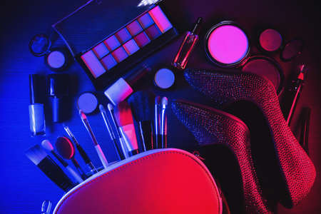 Cosmetic bag, makeup brushes, eyeshadows palette, lipstick and high heels shoes on the flat lay table background in the neon lights.