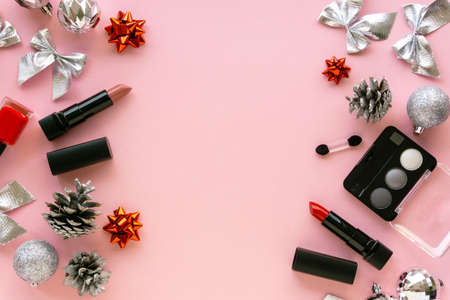 Christmas flat lay of makeup products and decorations. Eyeshadow palette and lipsticks on a pink background.