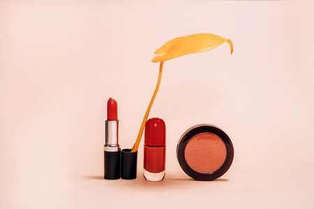 Decorative composition with cosmetics, woman beauty products, red lipstick, blush and nail polish, decorated with autumn yellow leaf on light background, fashion still-life
