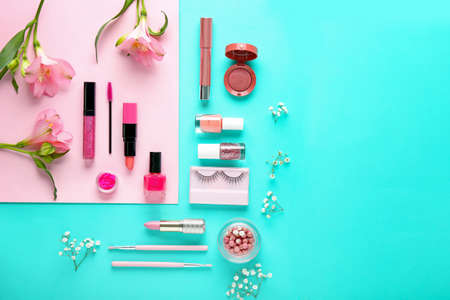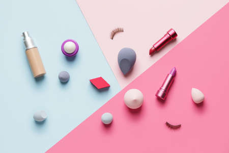 Different makeup products on color background, top view.