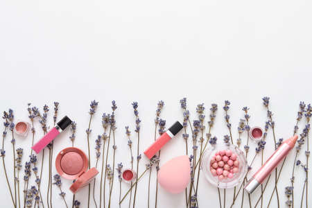 Set of decorative cosmetics with lavender flowers on white background