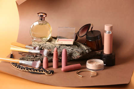 Set of decorative cosmetics and accessories on color background
