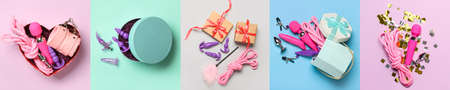 Collage with different sex toys on color background