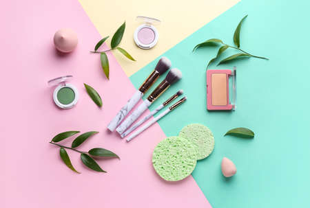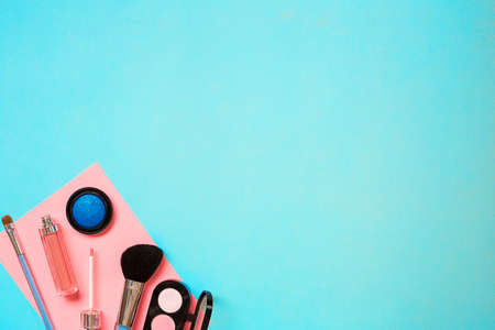 Professional decorative cosmetics and makeup tools brushes on colorful background. Beauty and fashion concept. Flat lay composition. Top view.