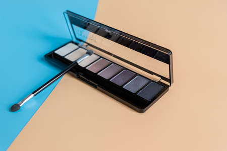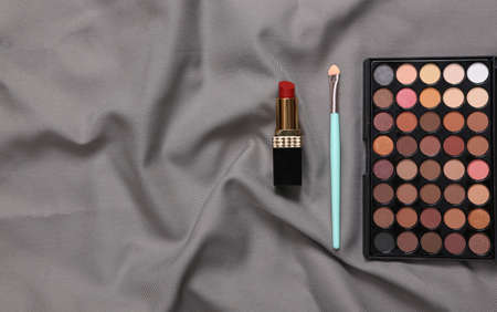 Bright make up eye shadow palette, lipstick and Makeup brush on gray silk background. beauty still life.