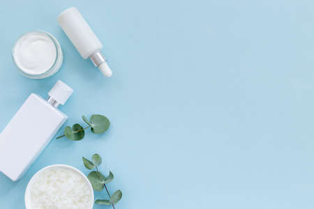 Flatley layout with eco-friendly cosmetics. Natural cosmetics, skin care products-cream, lotion, soap on a blue background with green leaves.