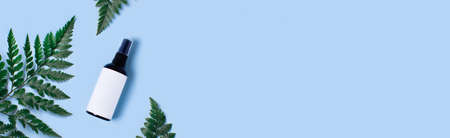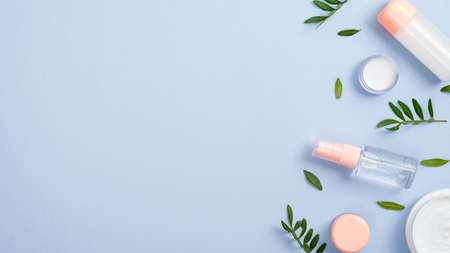 Organic facial cosmetic products and green leaves on pastel blue background. Natural beauty product concept. Minimal flat lay style composition, top view, copy space.