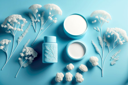 Winter skincare and beauty concept with cosmetic products and holiday-themed decorations on a blue background