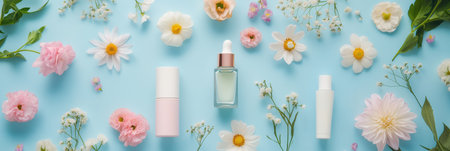 Soft pastel flowers surround various organic cosmetic products, creating a serene and natural beauty display.