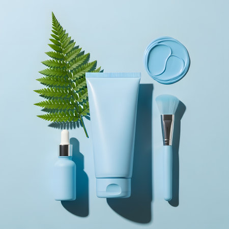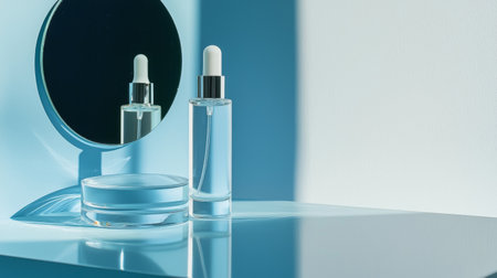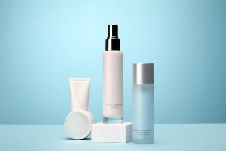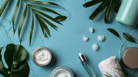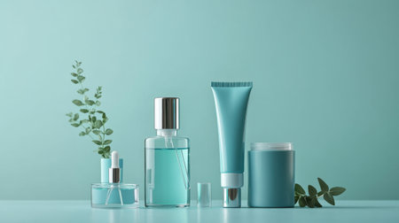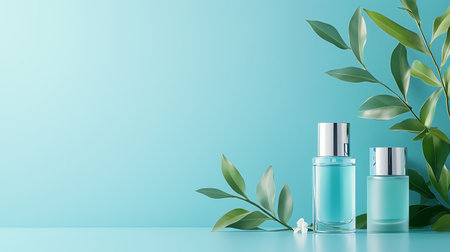 Elegant beauty products displayed on a soft turquoise background, with green leaves adding a touch of nature and freshness to the serene arrangement.