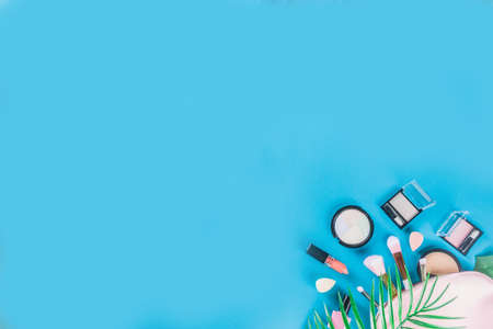 Professional makeup cosmetic set, with summer tropical leaves, woman bag. Make up items. luxury decorative cosmetics flatlay, top view, mockup. Beauty blogger concept. Trendy turquoise background