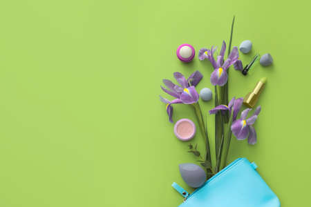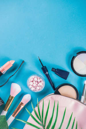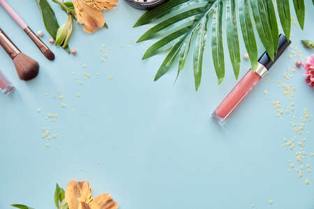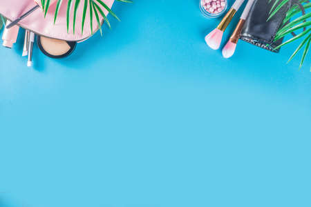 Professional makeup cosmetic set, with summer tropical leaves, woman bag. Make up items.