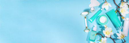 Spring face skin care, hand care cosmetic in unbranded containers, bottles, tubes with spring flower twigs on light blue turquoise background. Spring hand skin care cosmetics background top view copy space