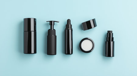 Black cosmetic containers arranged neatly on a light blue background for beauty product display and marketing purposes
