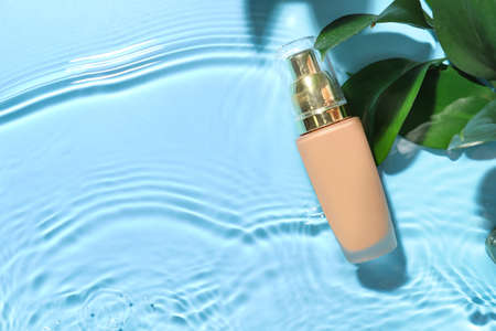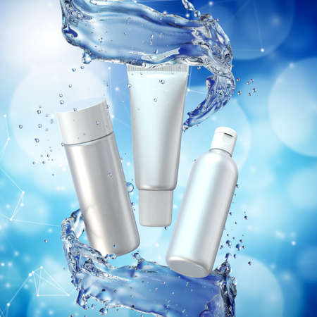 Cream bottle mock up in water splash on blue bokeh background. 3D illustration