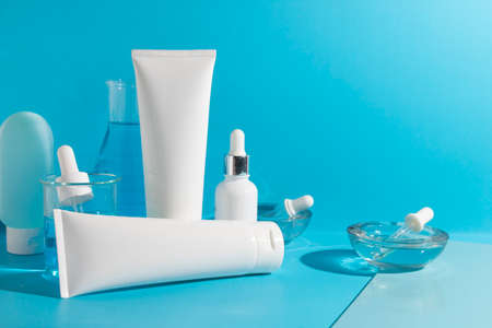 Set of cosmetic products on blue color background, flat lay with space for text. White tubes, branding mock up, top view. Beauty blogger, salon treatments concept. Minimalism