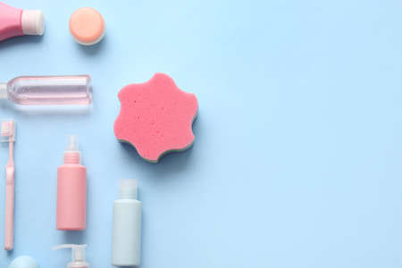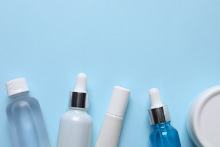 Many bottles and tube of cosmetic serum on light blue background, flat lay. Space for text