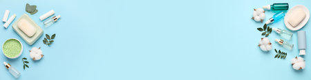 Cosmetic products and cotton flowers on light blue background, flat lay. Banner design with space for text
