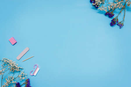 Manicure tools on a blue background are decorated with white gypsophila flowers. The concept of beauty. Copy space. top view.