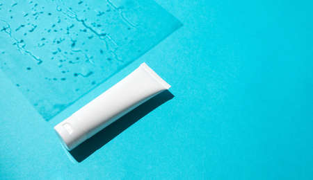 Summer skincare concept. Blank white plastic cosmetic tube on blue background and water splash shadow. Cream, hand moisturizer, shampoo or facial cleanser container