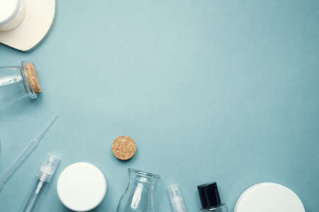 Collection of cosmetic bottle containers, Blank label for branding mock-up, Flat lay on color background.