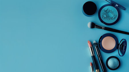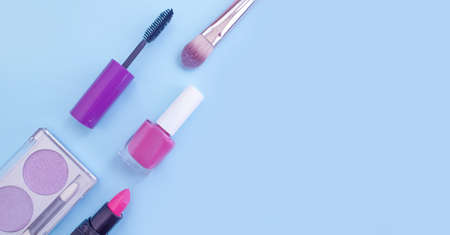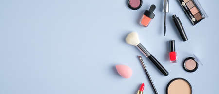 Beauty salon banner design template. Makeup cosmetic products on blue background. Top view with copy space