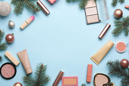 Makeup products and Christmas decorations on color background. Top view New Year Beauty concept with copy space.