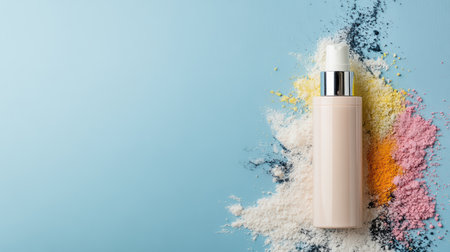 An Artistic mock up of cosmetic bottle with colorful powders scattered