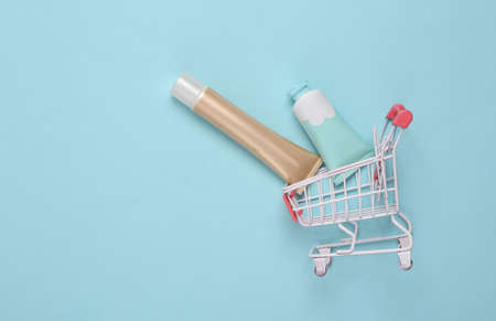 Make-up products with shopping cart on blue background. Makeup cosmetics sale concept. Copy space