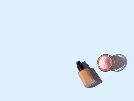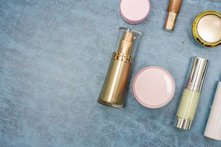 Mock up cosmetic products, bottles, brushes for make up, powder and flowers. Beauty concept. Top view, copy space blue background. High quality photo