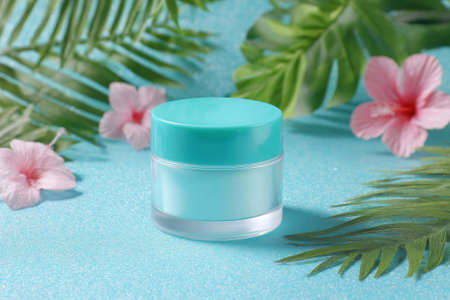 cosmetic cream on a blue background with tropical flowers and palm leaves